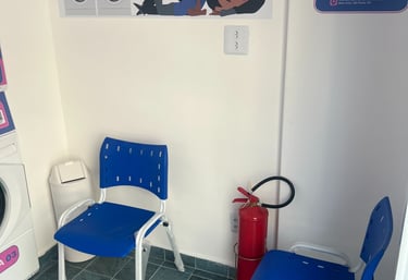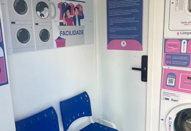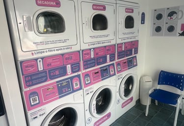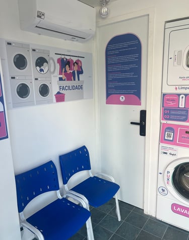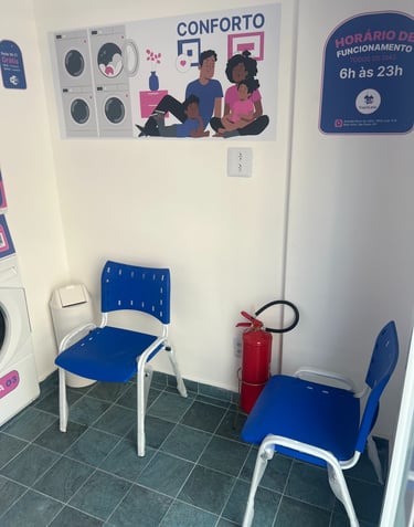 A lavanderia possui um ambiente climatizado por ar condicionado e conta com uma Alexa que poderá atender a seus desejos de solicitar a "ela", tocar as músicas preferidas, enquanto aguarda a lavagem ou secagem de suas peças.